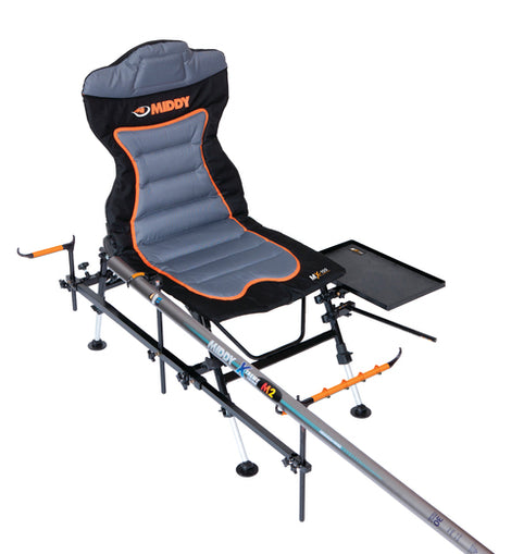 A revolutionary chair, offering incredible comfort and the ability to fish either the pole or feeder rod when fitted with the unique side-bar and rests. It folds down to a compact size for ease of transportation and has many excellent features, including a high padded head rest, adjustable legs, swivel mud feet, recliner seat position and a special cutaway groove for ease of shipping a pole back.